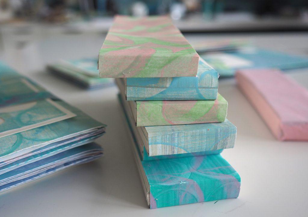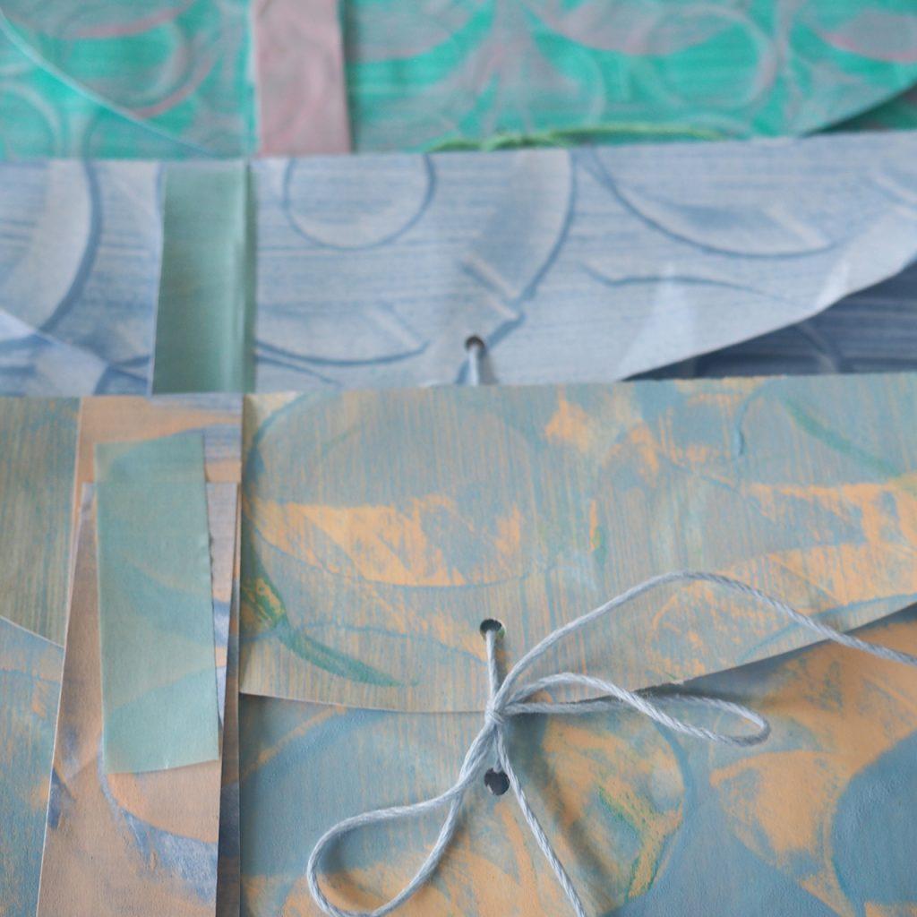 Was ist nun mein persönliches Fazit der Frühlingspost? Nach einer Kleisterpapier-Aktion mit Frau Buntpapier-Fabrik vor einigen Jahren waren dies meine ersten eigenständigen Kleistererfahrungen. Die Technik ist ganz nett, bietet viele Möglichkeiten. Mir ist sie ein wenig zu matschig und zufällig, die Trocknungszeiten und das gewellte Papier mag ich nicht so. Es ließ sich aber ganz gut wieder glätten durch Pressen und teilweise auch Bügeln. Für Workshops in meinem Studio ist diese Technik nicht so gut gegeignet, dafür reicht mein Platz zum Kleistern und Trocknen nicht. Ich habe alleine schon jeden denkbaren Platz belegt. Vielleicht kleistere ich demnächst nochmal zarte Hintergründe, die ich dann im nächsten Schritt mit Schablonendruck bedrucke, das kann ich mir spannend vorstellen.