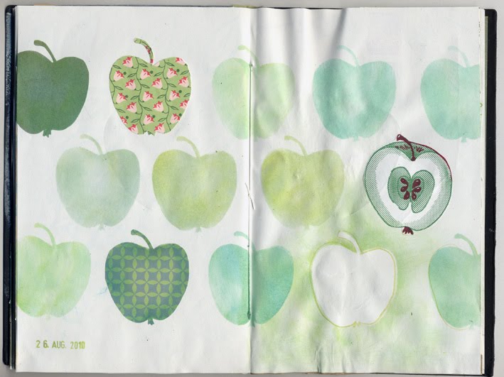 Gestern habe ich frische grüne Äpfel geerntet. Und wie verarbeite ich sie? Bisher weder zu Apfelmus noch zu Apfelkuchen, sondern zu Apfelkunst im Skizzenbuch.