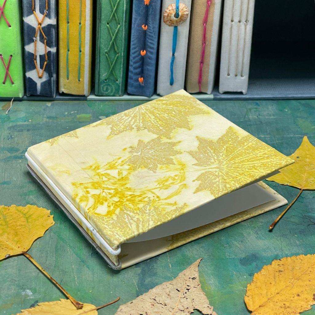 Ich habe mein Blätterbüchlein nun auch soweit vorbereitet und mit einem leuchtend gelben Eco-Print-Papier eingebunden. Das Papier ist ein Abfallprodukt meines großen Projekts, über das ich ganz bald auch viel mehr erzählen darf und das sehr gut zum Monatsthema „Blätter“ passt. Falls ihr den Podcast letzte Woche gehört habt, wisst ihr schon Bescheid!