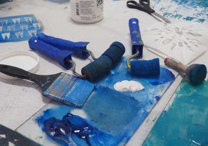 Ich mag Blau, deshalb mache ich heute Blau! In diesem Jahr auch wieder ein kräftiges Ultramarin, dass in den letzten Jahren etwas im Schrank verschwunden war. Aus kleinen Tulpenstempeln sind Muster entstanden, die mich sehr faszinieren. Ich mag es so sehr, wenn aus einfachen Formen durch Reihung und Drehung und Spiegelung komplexe Muster entstehen. Diese hier haben irgendwie etwas holländisches an sich – das ist wohl die Sehnsucht, die sich in drei Wochen erfüllen wird.
