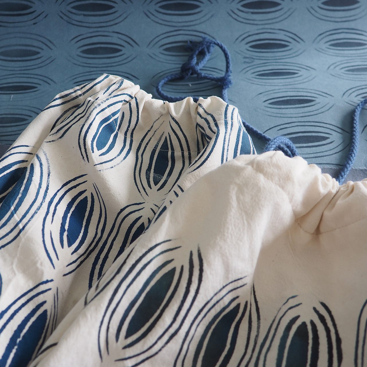 Dieses Motiv wollte ich unbedingt auf Stoff testen und stellte dabei fest, dass die Form auch ein Brötchen darstellen könnte. Gleichzeitig ist das Muster so grafisch und abstrakt, dass es ein allgemeingültiges Stoffmuster ergibt.