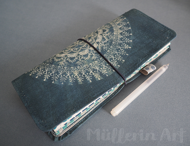 Das neue Jahr wird anders: Der Kalender ist eine textile Notizbuch-Hülle mit Gummiband-Bindung mit einem Sonnendruck-Stoff-Einband von der genialen Andie. Sie hat mir den Stoff im Oktober beim „Textile Bücher“ Workshop geschenkt, mit den Worten, es wäre ein Fehldruck. Das sehe ich anders, für mich ist er perfekt für ein neues selbstmachtes Kalender-System.