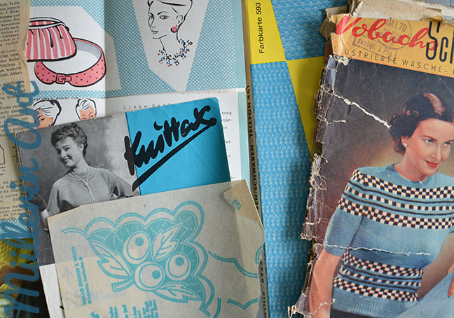 Eine wunderbare Sammlung aus den 50iger und 60iger Jahren, sicherlich sind viele davon umgesetzt worden. Sogar Wollmusterkarten fanden sich in dem Karton… leider riecht alles sehr nach Keller, aber trotzdem werde ich bestimmt einiges davon weiterverarbeiten.