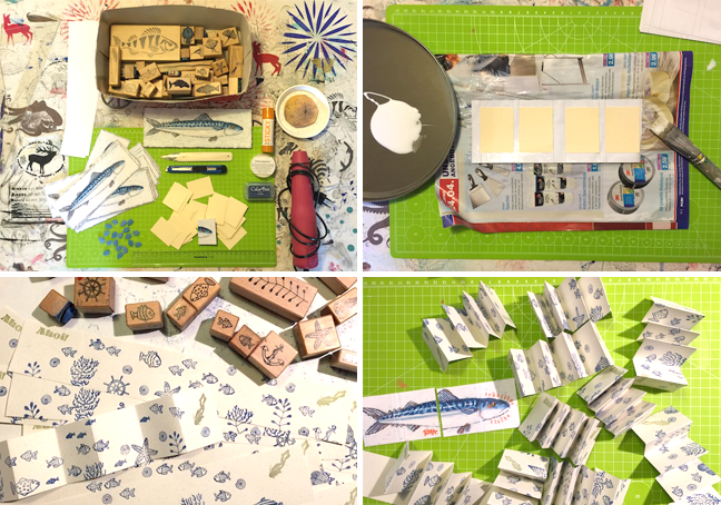 Letzten Freitag hatte ich Euch Rimas Bilder versprochen. Sie hat keinen Blog und zeigt hier einen kleiner Überblick, wie ihre Fischbüchlein mit vielen vielen selbst hergestellten Stempeln entstanden sind. Rima fragt: „Wenn Du noch jemanden kennst, der eins von meinen