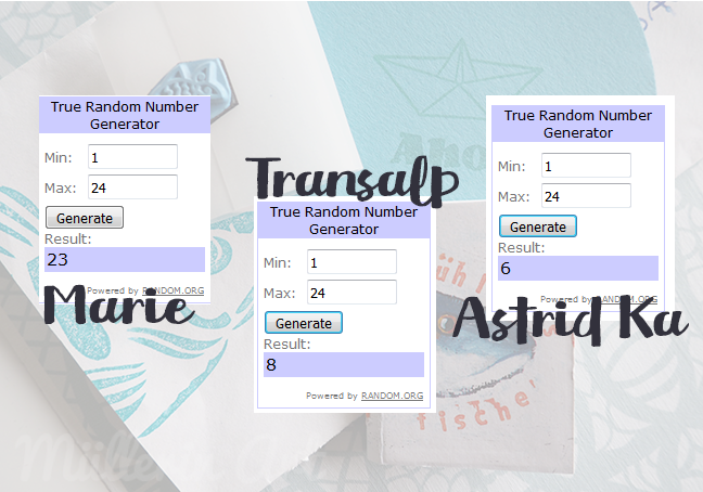 Die drei Gewinner von Rimas Fischbüchlein stehen fest. Herzlichen Glückwunsch! Marie und Judith (Transalp) schickt ihr mir bitte eure Adressen (per mail: info(ät)michaela-mueller-design.de). Astrids kenne ich! Ich gebe sie dann an Rima weiter, die euch die Büchlein direkt zuschickt.