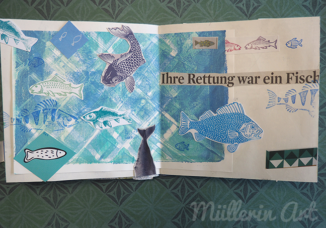 Immer wieder werde ich mit Fischen beschenkt. Deshalb zeige ich heute eine Fischseite aus dem Skizzenbuch, die ich fast komplett mit geschenkten (oder gefundenen) Fischen gestaltet habe. Vielleicht erkennt die eine oder andere einen Fisch wieder? Sie schwimmen auf einem Rauten-Gelliprint auf der Rückseite des Minibuchs, um Jorins Frage von Mittwoch zu beantworten. Deshalb konnte ich auf der Seite nicht gut zeichnen oder drucken, aber kleben!