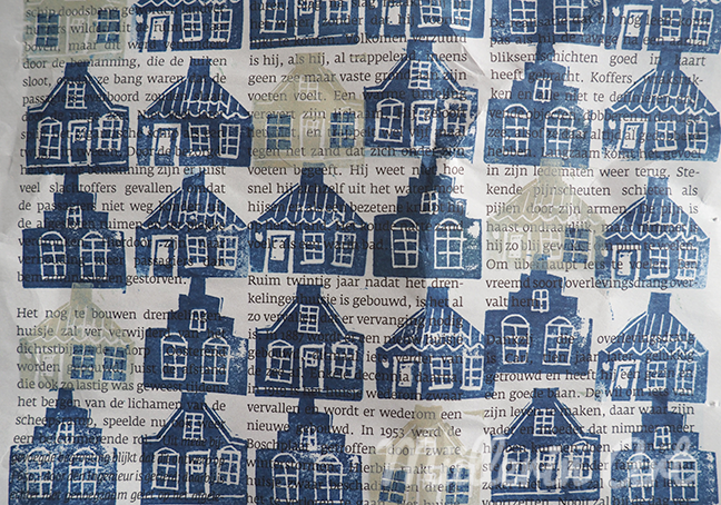 Deshalb habe ich lieber mit ganzen Häusern gemustert. Kleinen friesischen Bauernhäusern mit Sprossenfenstern, schönen Giebeln und tief heruntergezogenen Dächern. Drei kleine Stempel habe ich vor Ort geschnitzt und damit eine einheimische Zeitung vollgestempelt …