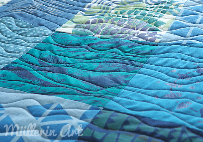 Da hast du jetzt einen ganz zauberhaften Quilt auf dem Bett, das klare Muster und die Wellen gefallen mir sehr. Und es ist gar nicht nass und schlüpfrig wie bei den Fischlein in Neptuns Reich, sondern weich und warm. Was für die Seele… Liebe Grüße ins Wochenende – Ghislana