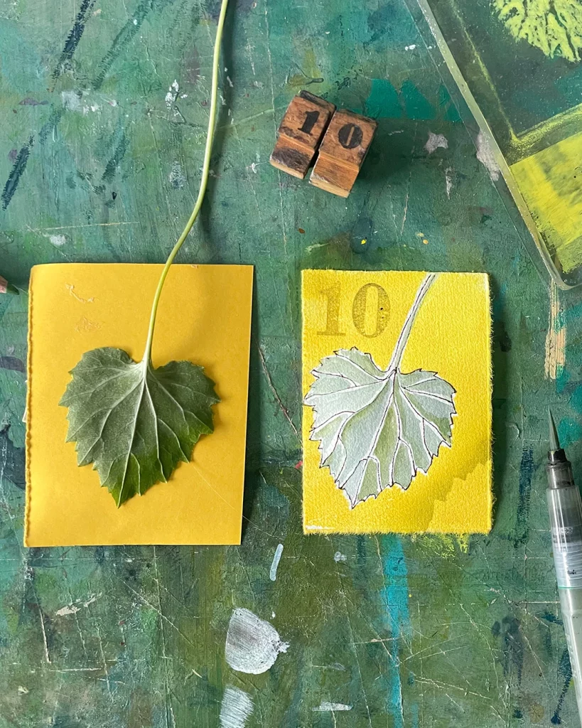 Mein 100-Tage-Projekt wächst. Nach den ersten 10 Tagen ist es schon ein Ritual. Jeden Morgen gehe ich kurz raus, um ein Blatt zu suchen. Der Garten hat auch jetzt schon genug Material zu bieten. Es wächst immergrünes wie Efeu und Heckenpflanzen, es finden sich Nesseln und Spitzwegerich, im Hochbeet noch einzelne Sellerie und Mangold-Blätter. Dann setze ich mich immer als erstes, bevor der Arbeitstag richtig losgeht, an den Tisch und zeichne. Ich wundere mich über mich selber, dass ich bisher sehr realistisch arbeite. Nach den ersten beiden Blättern bin ich dazu übergegangen, die Blätter in Originalgröße auf meine kleine Karte zu abzubilden. Deshalb passen sie auch nicht immer ganz drauf, bieten aber spannende Ausschnitte. Keine Ahnung, ob ich dieses Prinzip durchziehe. Ich möchte gerne auch noch ganz andere Techniken und Materialien ausprobieren. Bisher arbeitet ich immer mit einer Mischung aus Bleistift, Aquarellmarkern, Aquarell aus dem Kasten und Buntstiften. Es darf gerne noch wilder werden, aber vielleicht brauche ich diesen realistischen Start, um bei den Blättern anzukommen. Der Hintergrund hat sich vom Februar-Pink zum März-Gelb entwickelt. Ich habe absichtlich einen weichen Übergang gewählt, damit die Blätter zusammen gehören.