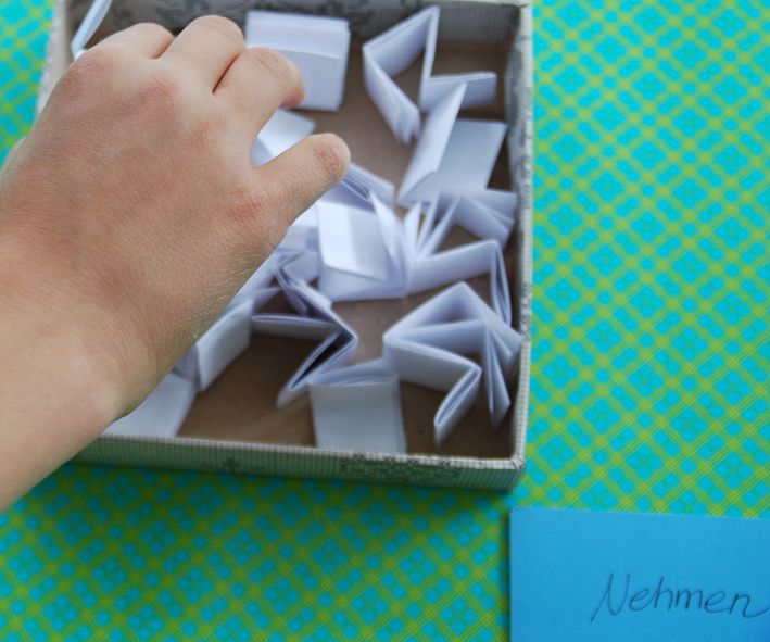 Die Ziehungsbeamten haben sich von dem ordnungsgemäßen Zustand der Lose überzeugt und sind zur Tat geschritten. Töchterchen hat ausgelost, wem ich etwas geben darf.