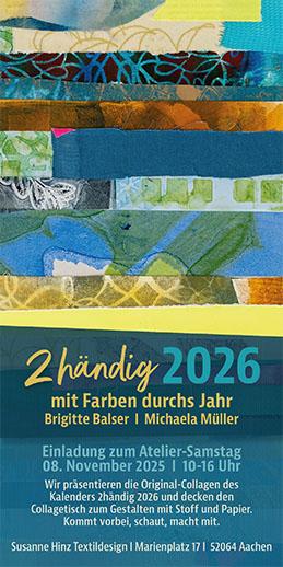 Zum Erscheinen des neuen 2händig-Kalenders 2026 gibt es in diesem Jahr eine Ausstellung in Aachen. Im wunderschönen Ladengeschäft der Textildesignerin Susanne Hinz, zwischen Hauptbahnhof und Innenstadt gelegen, dürfen meine Schwester und ich im November die Originalcollagen des Kalenders ausstellen, dazu präsentieren wir einige Motive als Großformartdrucke. Am 8. November eröffnen wir die Ausstellung mit einem Ateliersamstag, an dem wir den ganzen Tag im Laden sein werden. Es wird einen Collagetisch geben, an dem Gäste selbst kreativ werden können.