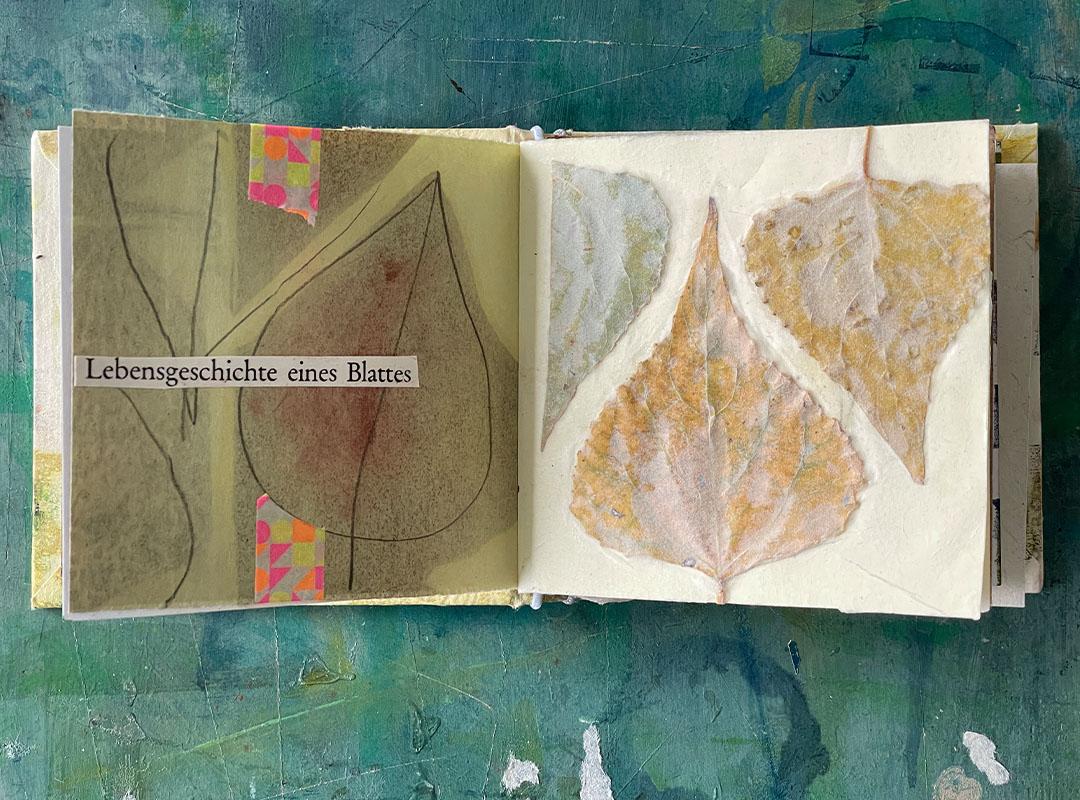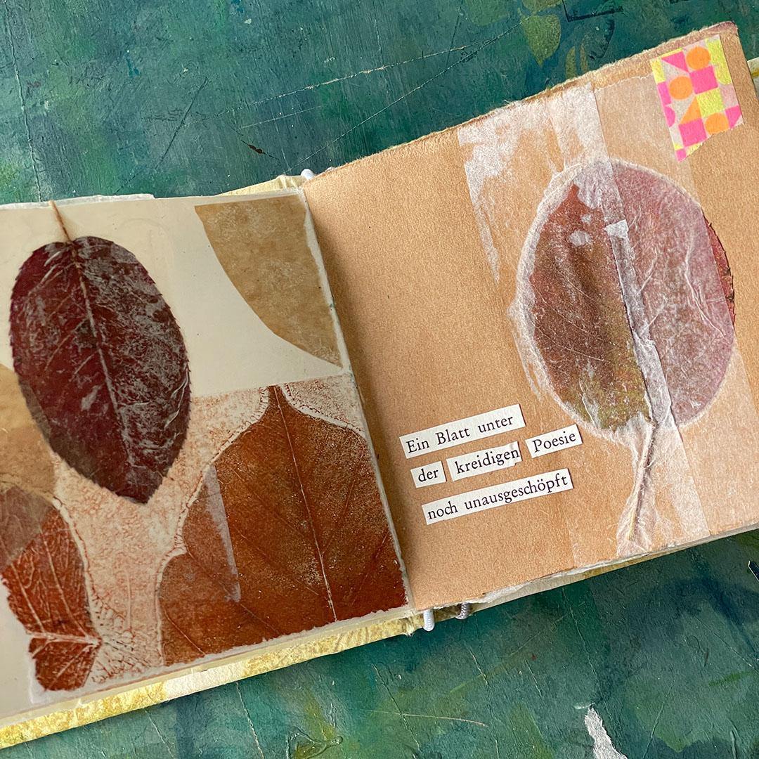 Die Blätter des Oktoberbüchlein füllen sich mit Blättern, das war der Plan. Ich habe etwas experimentiert mit Teabag-Paper, das Eva mir zum Testen geschickt hat. Es ist sehr schön zart, mit Matt-Medium aufgeklebt wirkt es fast transparent und eignet sich sehr schön dafür, Blätter aufzukleben. Passende Zeilen fanden sich auch schon wieder.