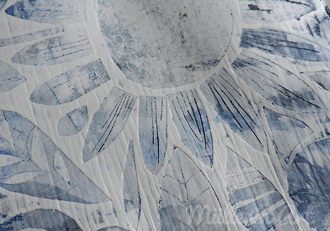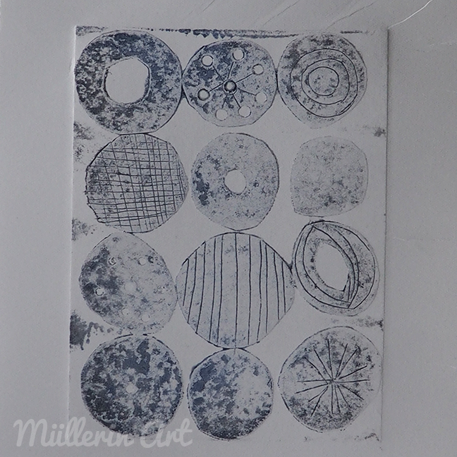 Das Papier war nicht eingeweicht und ich hatte nicht wirklich Zeit. Trotzdem mag ich diesen Kreisdruck schon ganz gerne, denn hier sind die eingeritzten Linien gedruckt: Tiefdruck also!