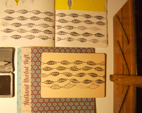 Die Herbstferien beginnen und ich verabschiede mich mit einem Blätter-Fisch-Stempel, der gestern spontan geschnitzt werden wollte. Das ist dann endlich mal wieder ein „Fisch am Freitag“, mehr Fische werde ich dann in Holland essen, wohin ich mich hiermit verabschiede, das Holland- Herbst-Heft wartet auf Skizzen und Eingebungen, das Nähkästchen ist gepackt! Dazu kommen noch leere Postkarten in den Koffer, die ich an drei nette Damen verschicken werde – mein Beitrag zu Janas Postkarten-Swap. Ich habe schon Post bekommen, aber dazu später mehr!