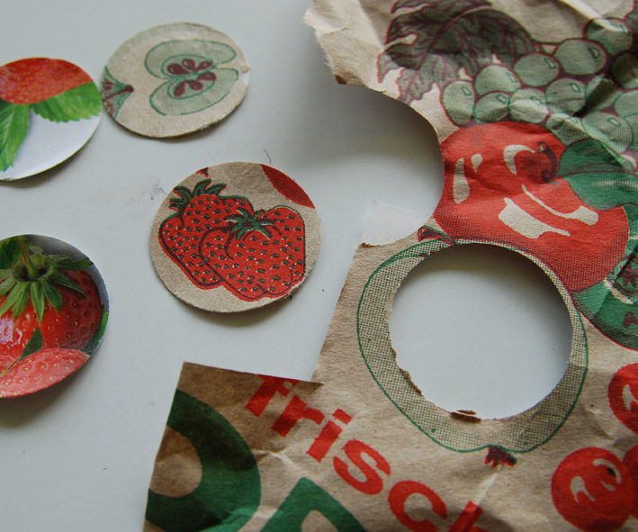 Die Weiterentwicklung der  Klebebänder sind jetzt runde Aufkleber, diese hier habe ich aus einer alten Obstüte vom Markt und aus Zeitschriften gebastelt. Zunächst das doppelseitige Klebeband auf die Rückseite aufbringen, dann kommt mein geliebter Kreisstanzer zum Einsatz, Auschnitt wählen…