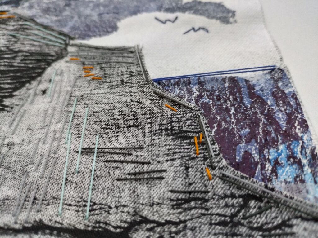 Verschiedene textile Bücher als Test-und Prototypen sind letztes Jahr in Vorbereitung auf das Buch entstanden, auch ein Gummiband-Buch mit Sonnendruck-Stoffen. Dieses hier könnte ich für einen Teil meiner Vogel-Hefte der diesjährigen Sommerpost nutzen. Ein anderes gibt es als Anleitung im Buch.
