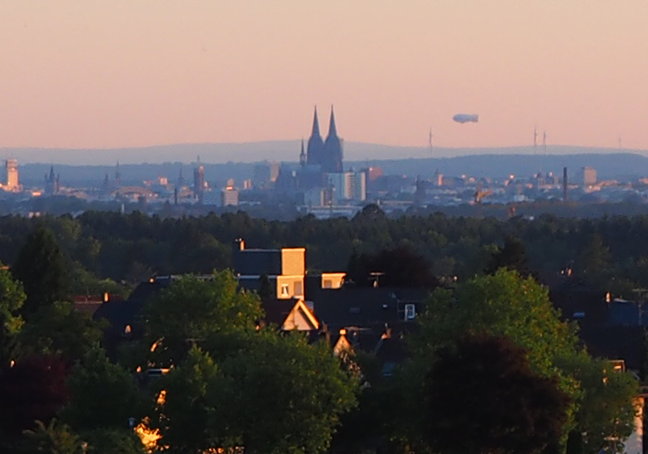 Es war ein lauer Sonntagabend. Meine Tochter ist derzeit ganz fotoverrückt und fragt mich, ob ich noch eine Fotorunde mit ihr mache. Aber gerne doch und bitte zum Kölner Fenster, warmes Licht über der Stadt. Als wir die Lichtung erreichen, schwebt ein Zeppelin auf den Dom zu, genau der richtige Moment!