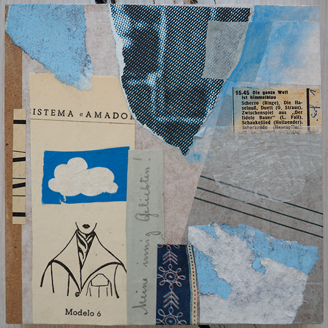 „Die ganze Welt ist himmelblau“ · Collage auf MDF · 15 x 15 cm · Mixed Media · gefundene Papiere |