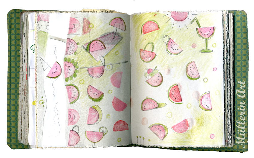 Die 7-Kilo Bombe, die ich angeschleppt habe, ist fast vertilgt und auch im Skizzenbuch hat sie Spuren hinterlassen (klebrige und farbige):