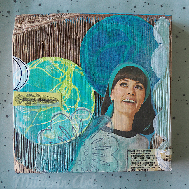 „Mit Schwung und guter Laune“ · Collage auf Treibholz · ca 15 x 15 cm · Mixed Media · alte Handarbeitszeitschriften · Gelliprints · gefundene Papiere |