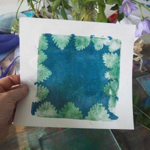 Aber am Ende des Abends war wieder Farbe übrig, die aufgebraucht werden wollte. Mein Plotter steht seit letzter Woche im Studio, ratterte vor sich hin, und spuckte eine einfache Oval-Schablone aus. Mit der konnte ich mit Restfarben und Restpappen eine kleine Postkarten-Serie drucken, die ich gut für die Oster-und/oder Frühlingspost gebrauchen kann.