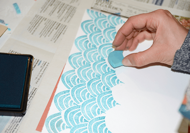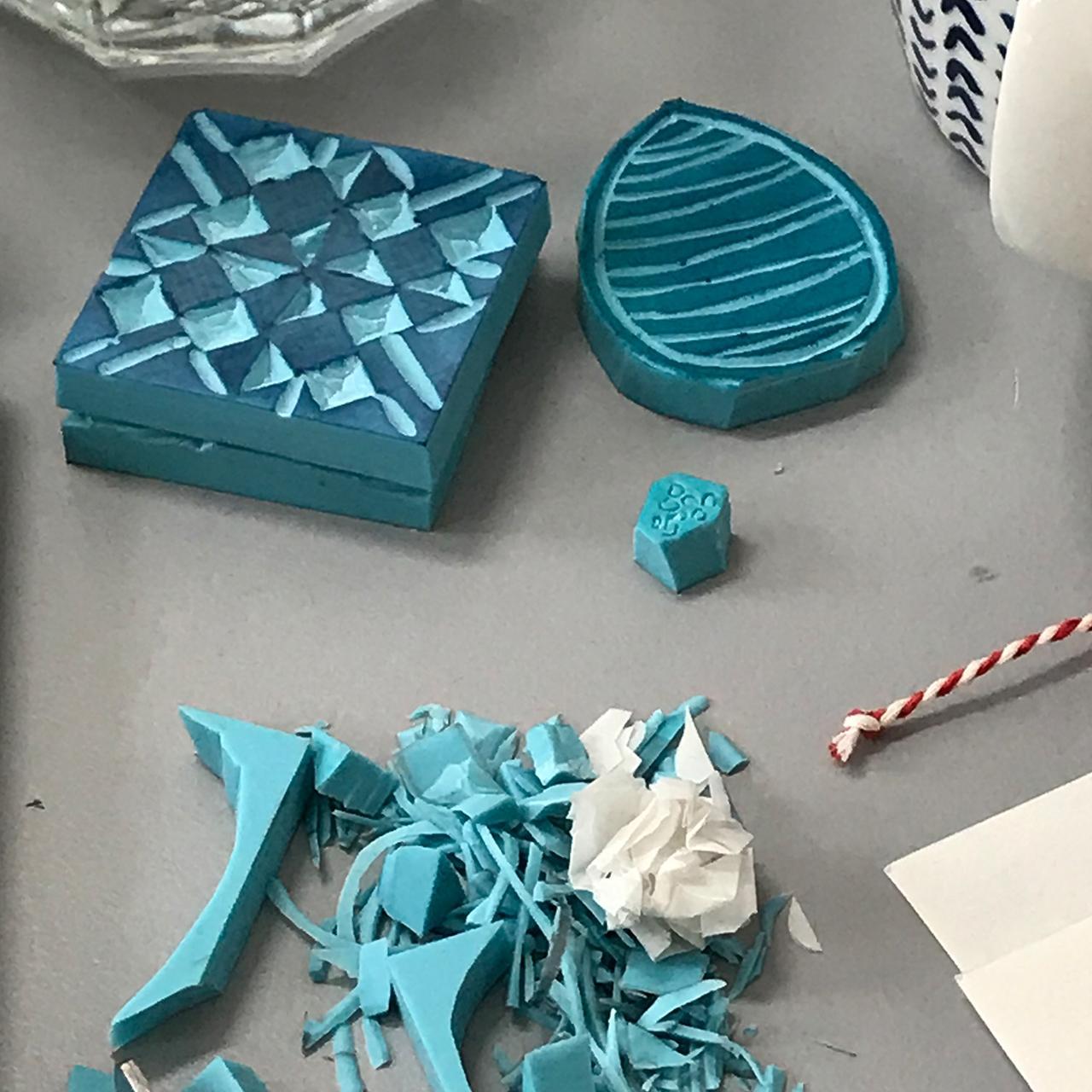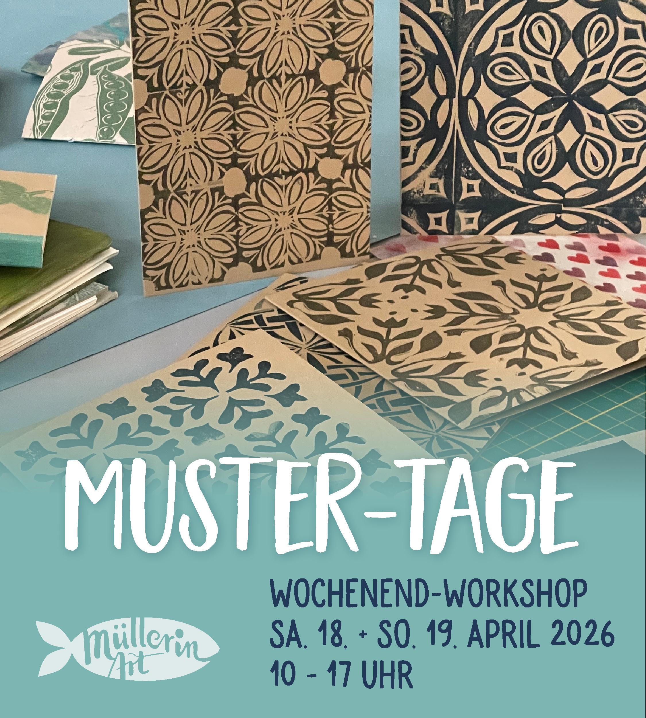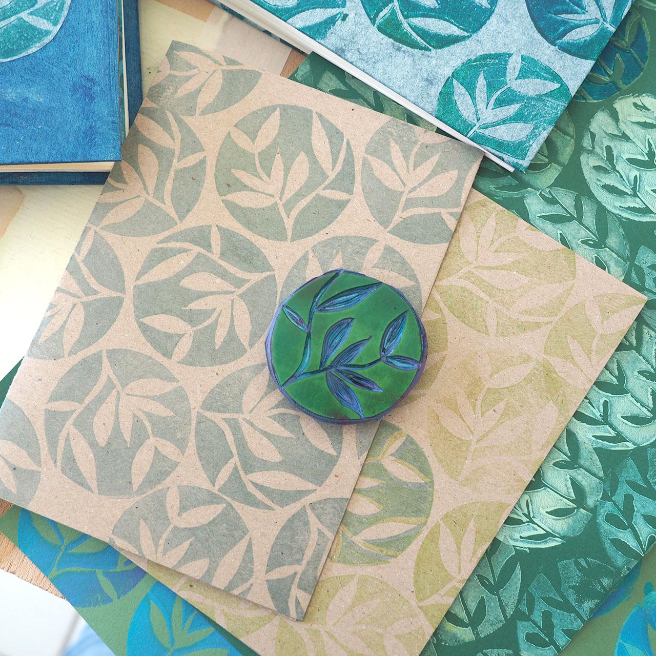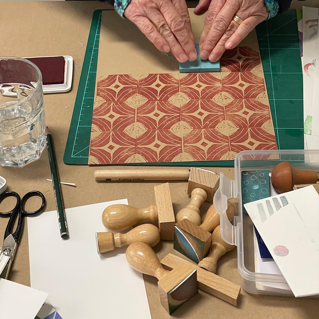 Muster entwerfen, Stempel schnitzen, Papiere bedrucken