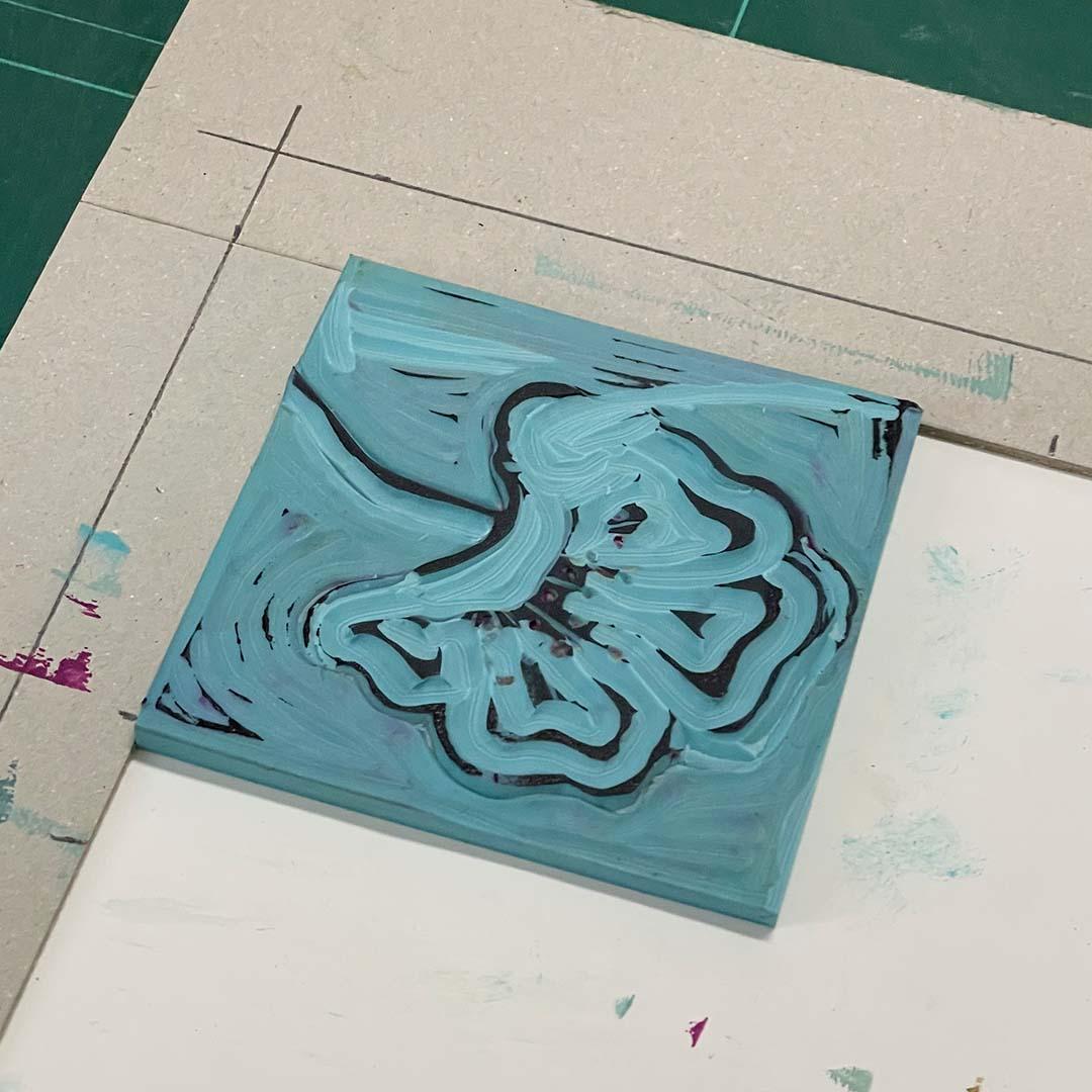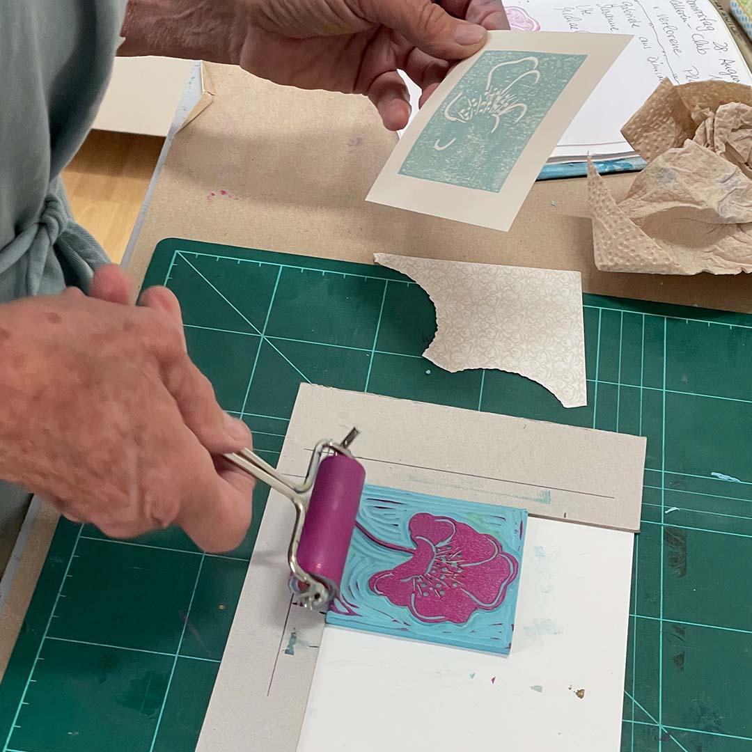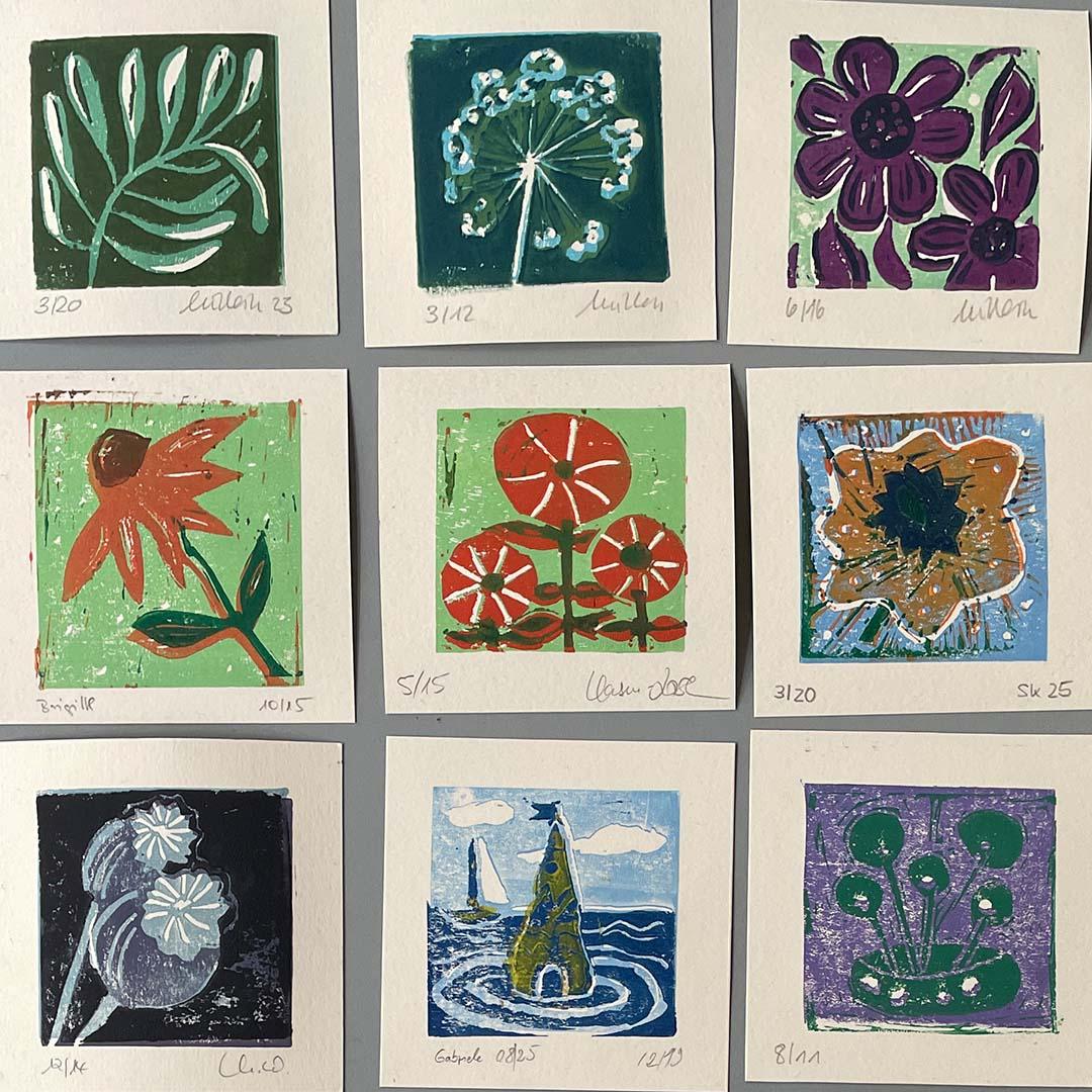 Eine Druckplatte, mehrere Farben, das ist mit der Drucktechnik des Reduktionsdruckes möglich. Dabei wird von hell nach dunkel gearbeitet und nach jedem Druckvorgang mehr von der Platte weg geschnitzt. Ein faszinierender Prozess, bei dem man ein wenig um die Ecke denken muss, der zu einer besonderen kleinen Edition von nicht wiederholbaren Drucken führt.