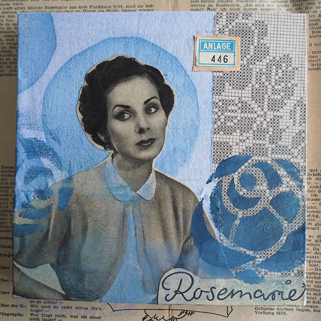 „Rosemarie“ · Collage auf Karton 15 x 15 cm · Mixed Media · alte Handarbeitszeitschriften · Sonnendruck auf Stoff · Schablonendruck · Acryl |
