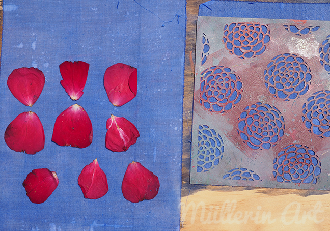 Am ersten Tag habe ich auch Versuche mit Rosenblättern gemacht und eine gekaufte Schablone genutzt, die ein wenig nach Pfingstrose aussieht.