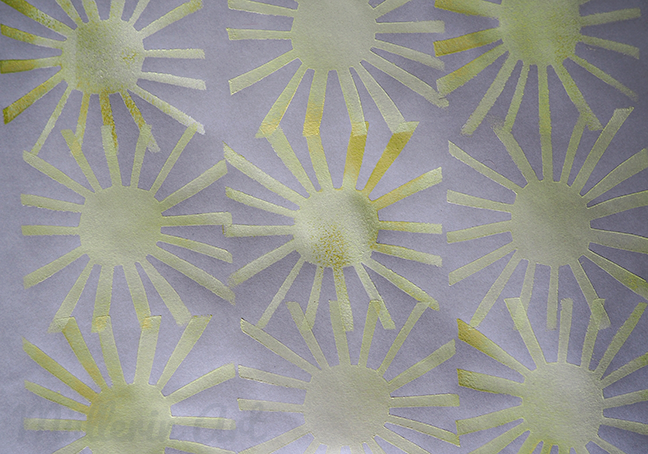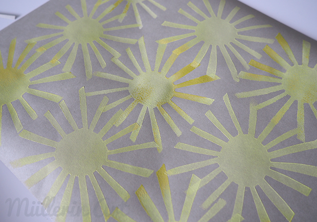 In meinem Buch – ich habe es am Montag vorgestellt – gibt es ein Kapitel über meinen geliebten Schablonendruck. Dafür habe ich diese Motive entworfen, die sich auch auf den Fotoalben auf dem Buchtitel wiederfinden. Sie waren auch gar nicht zuerst als Sonnen gedacht, sondern einfach als graphische Motive, die das Prinzip des Schablonendrucks in postiver und negativer Variante gut sichtbar machen: Alle Elemente müssen mit dem Rand verbunden sein.