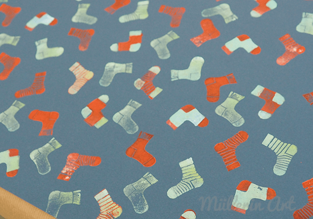 Ich kann keine Socken stricken, nur schnitzen. So ist dieser Stempel am Wochenende in meinem Workshop entstanden, mit Ringel und ohne, mit andersfarbigem Bündchen, Hacke und Spitze.
